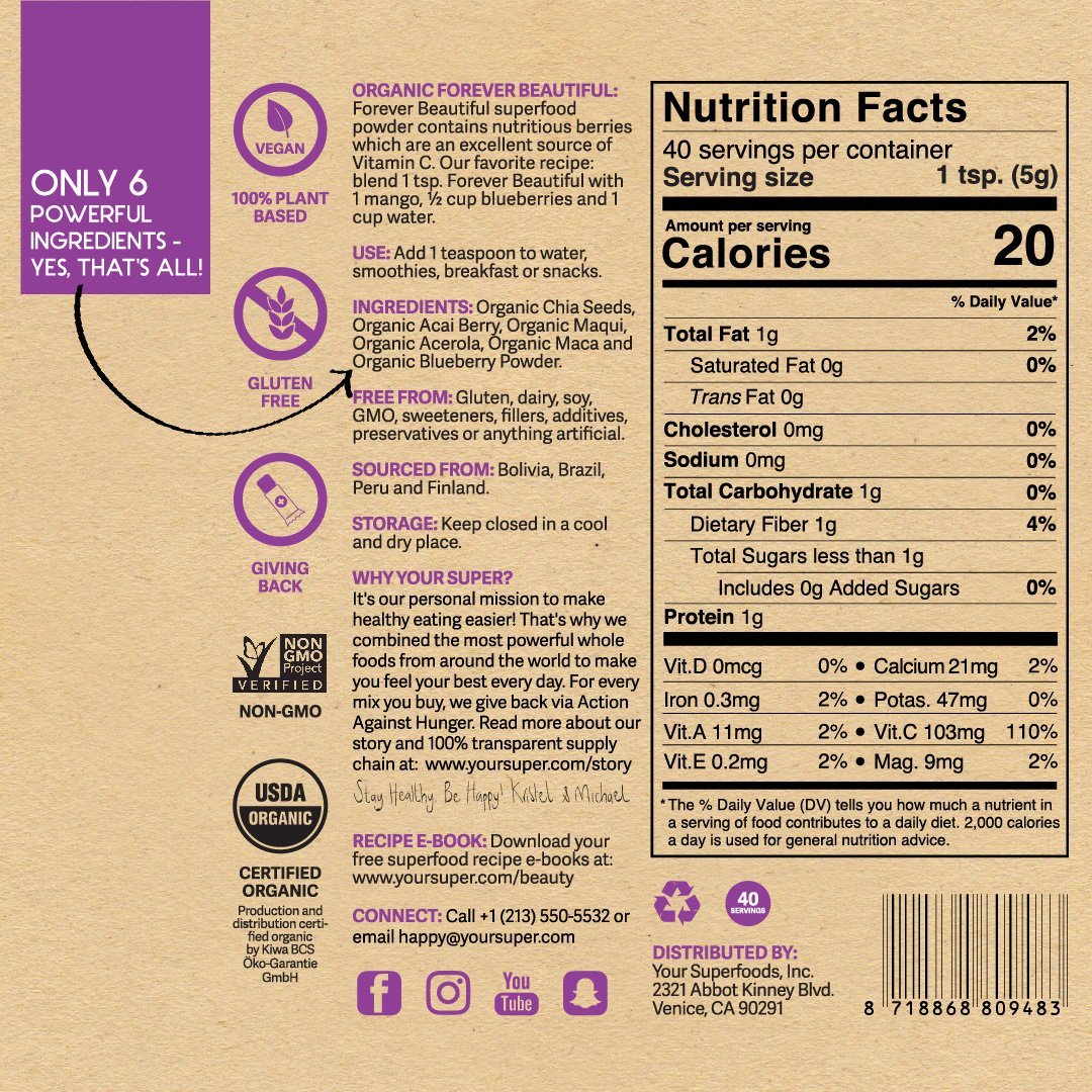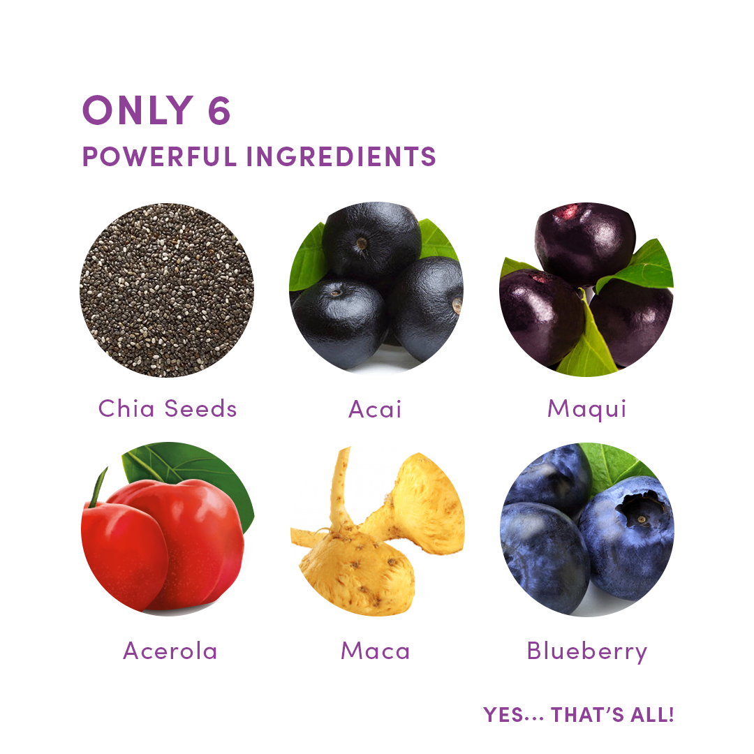 Ingredients: Chia Seeds* (Bolivia), Acai* (Brazil), Maqui* (Chile), Acerola* (Brazil), Maca* (Peru) and Blueberry* (Finland) Powder. *Organic Certified